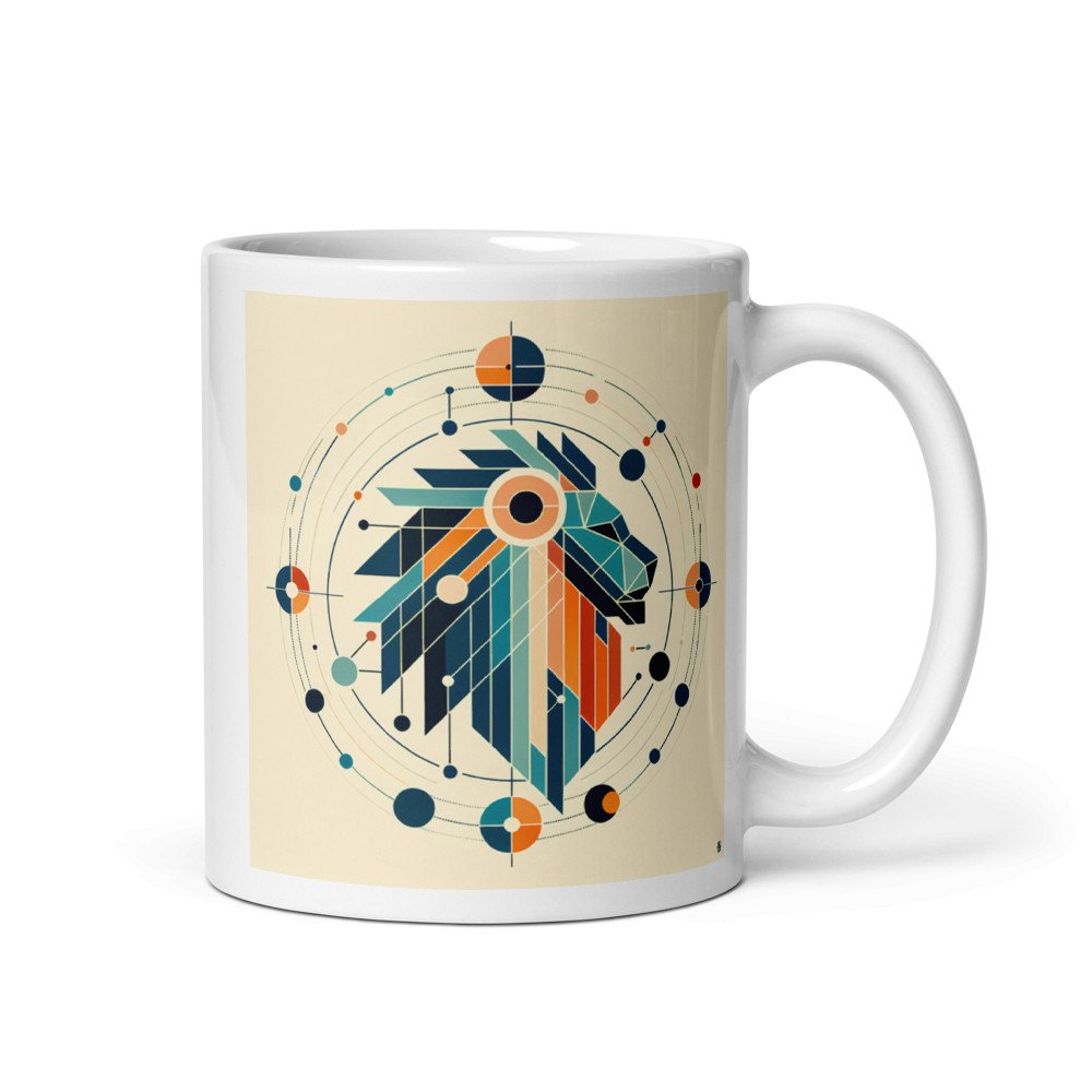 A geometric lion head is built from sharp angular shapes, orbital circles and balanced linework in teal, navy and orange. The composition blends a minimal zodiac aesthetic with celestial pattern details, creating a bold astrology symbol with a precise modern structure.