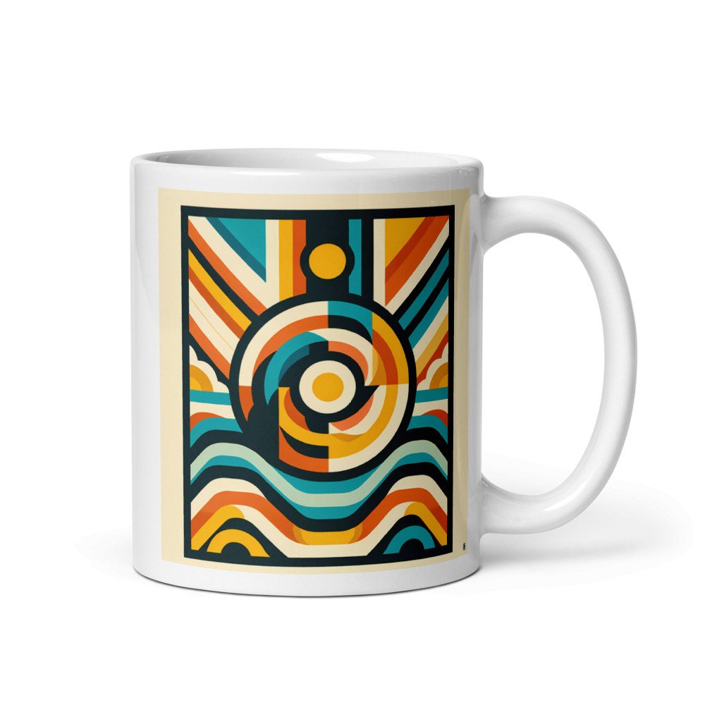 A bold geometric composition featuring a stylised sun, radiating striped rays and layered wave forms in teal, orange, cream and golden yellow. Thick outlines and circular shapes create a striking mid-century feel with a clean graphic text art sensibility. The balanced symmetry and saturated palette give it the look of modern type poster styling without any lettering.