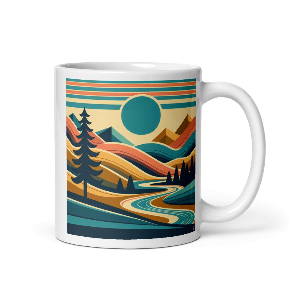 A stylised abstract landscape with layered hills, geometric mountains, a winding river and a bold circular sun. Teal, ochre and coral tones create a minimal landscape with flowing shapes and strong retro-inspired lines. The composition blends geometric nature elements with a clean, modern scenic feel.