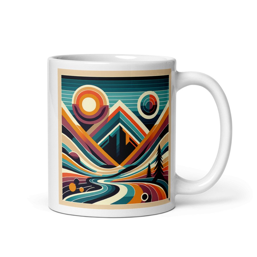 A bold geometric landscape featuring layered triangle mountains, circular suns and a winding river through a stylised valley. Teal, orange, cream and plum tones create a retro modern palette with clean symmetry and flowing shapes. The composition blends minimal mountain forms with nature geometry for a striking scenic design.