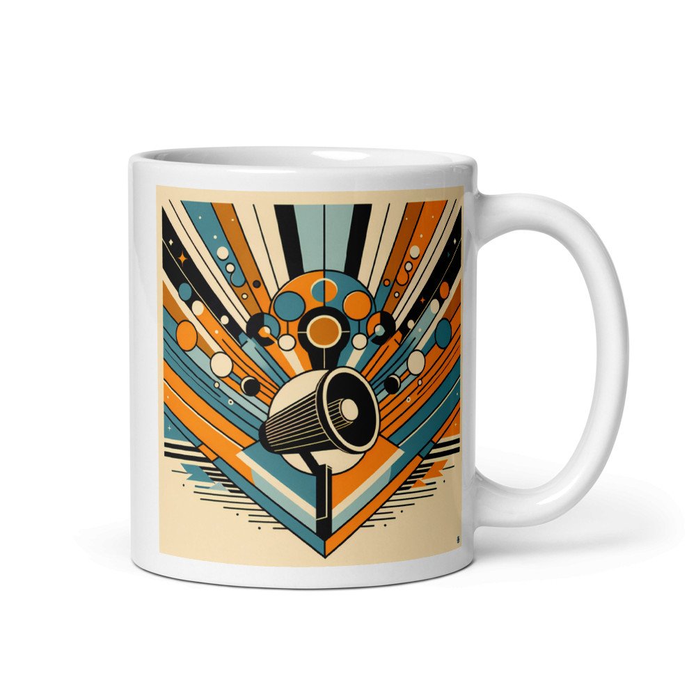 A stylised megaphone sits at the centre of a radiant composition of circles, stripes and angular beams in orange, teal, cream and black. The design blends bold typography energy with abstract type influences through strong letterform-like shapes and a clean retro-futurist layout. Crisp outlines and balanced geometry give it a striking graphic presence.