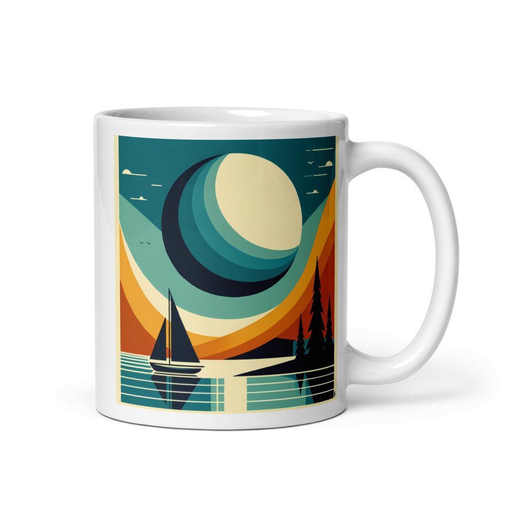 A large glowing moon hangs above a calm lake with a dark sailboat and pine silhouettes, built from clean layered shapes in teal, cream and burnt orange. The composition blends scandinavian design with a scandi minimalist feel, using simple geometric forms and a balanced neutral abstract palette.