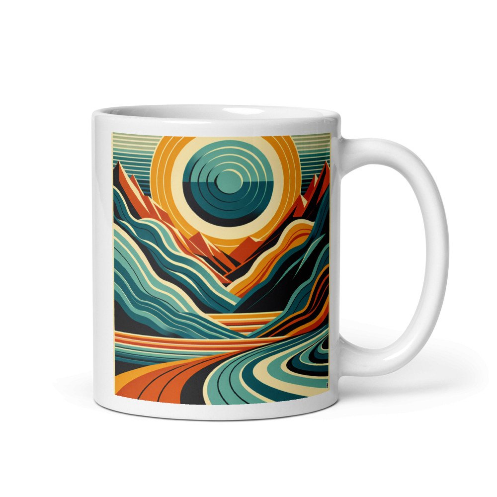 A bold abstract landscape with layered mountains, flowing bands and a large concentric sun at the centre. Teal, orange and cream shapes create a striking geometric mountains composition with a clean retro-modern feel. The design blends minimal landscape styling with strong silhouettes and rhythmic lines.