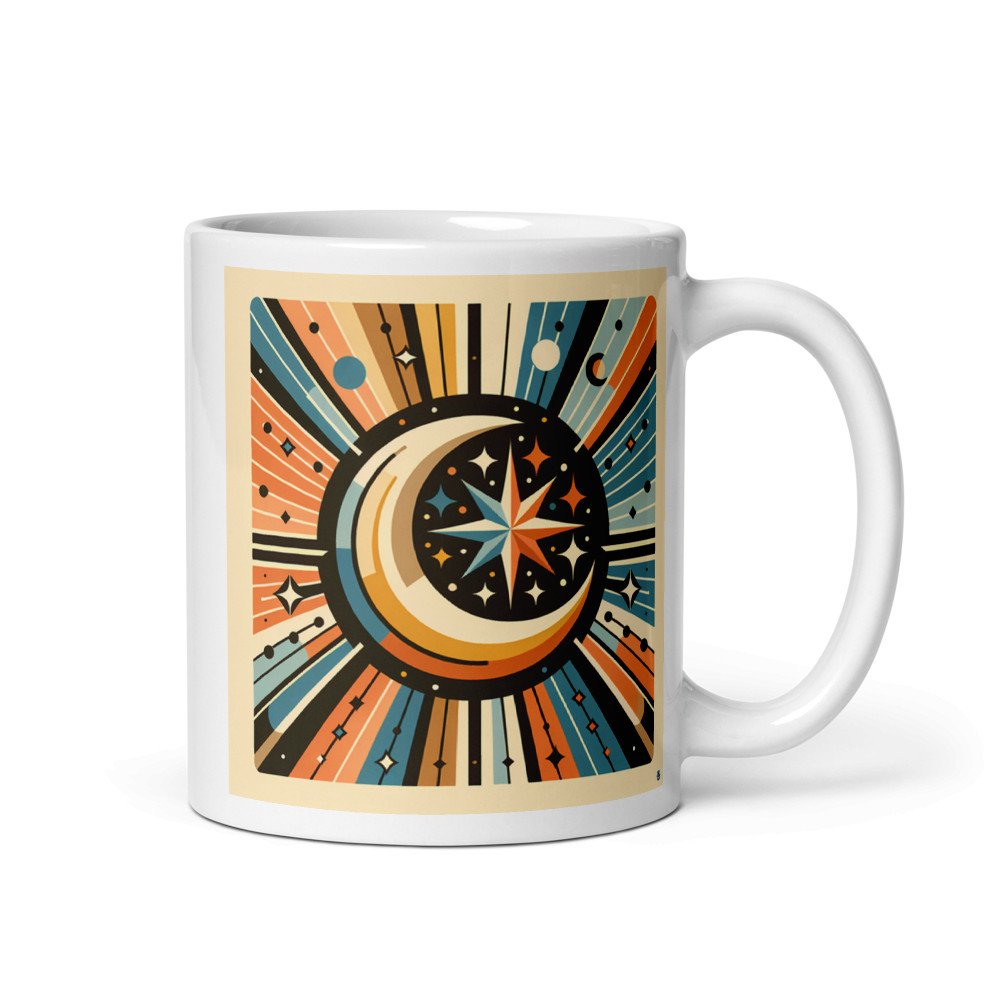 The glossy ceramic surface showcases the wraparound cosmic line art, turning each sip into a moment of quiet contemplation. Its sharp starburst and radiant lines in a retro palette are both striking and dishwasher-safe for daily use.