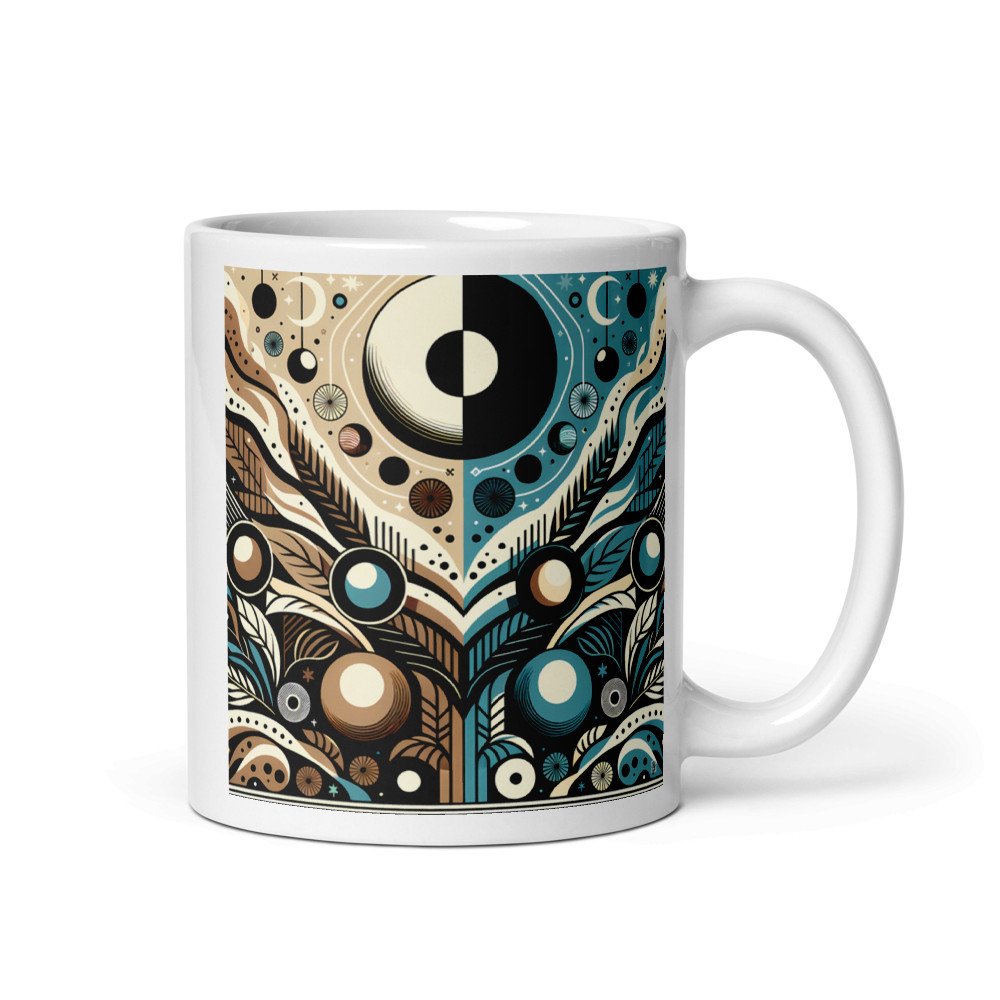 Your kitchen gains a mid-century focus with this glossy ceramic mug. The wraparound print places the symmetrical sun and moon composition in your hands, its bold teal and black contrast designed to withstand daily dishwasher cycles.