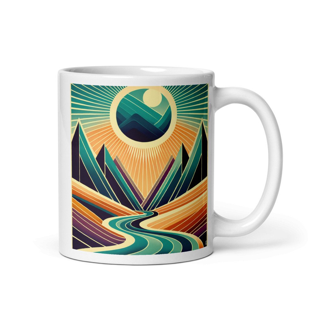 Bold teal peaks and a glowing orange sun adorn this glossy ceramic mug. The wraparound print turns your daily coffee ritual into a moment of modern art, with the clean, symmetrical landscape offering a serene visual anchor.