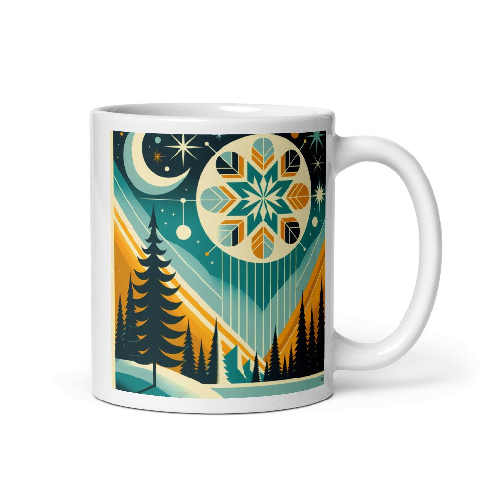 The glossy ceramic surface showcases the full wraparound print of this minimalist winter scene. Its teal and ochre layers bring a calm, geometric clarity to your morning routine, all on a sturdy, dishwasher-safe mug.
