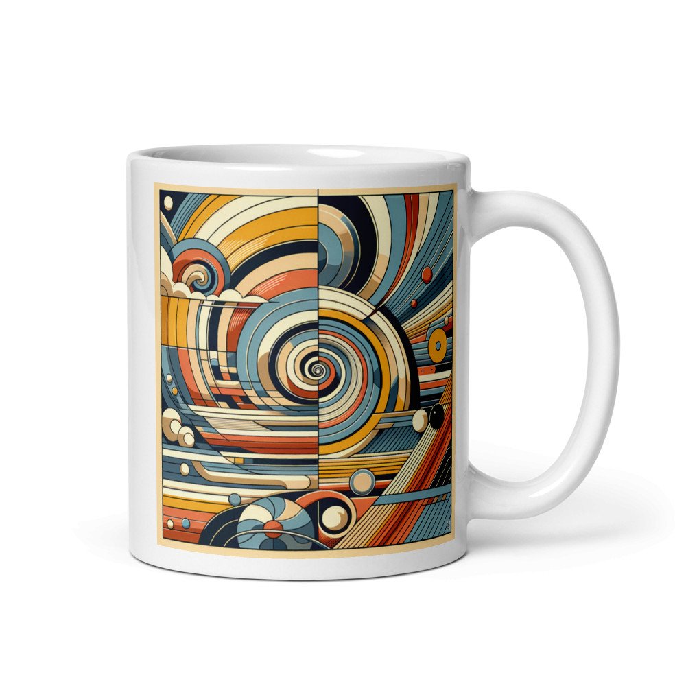 The bold, vintage geometry wraps seamlessly around this glossy ceramic mug. Enjoy the warmth of the teal and ochre spiral pattern with every use, printed on a durable, dishwasher-safe surface for daily appreciation.