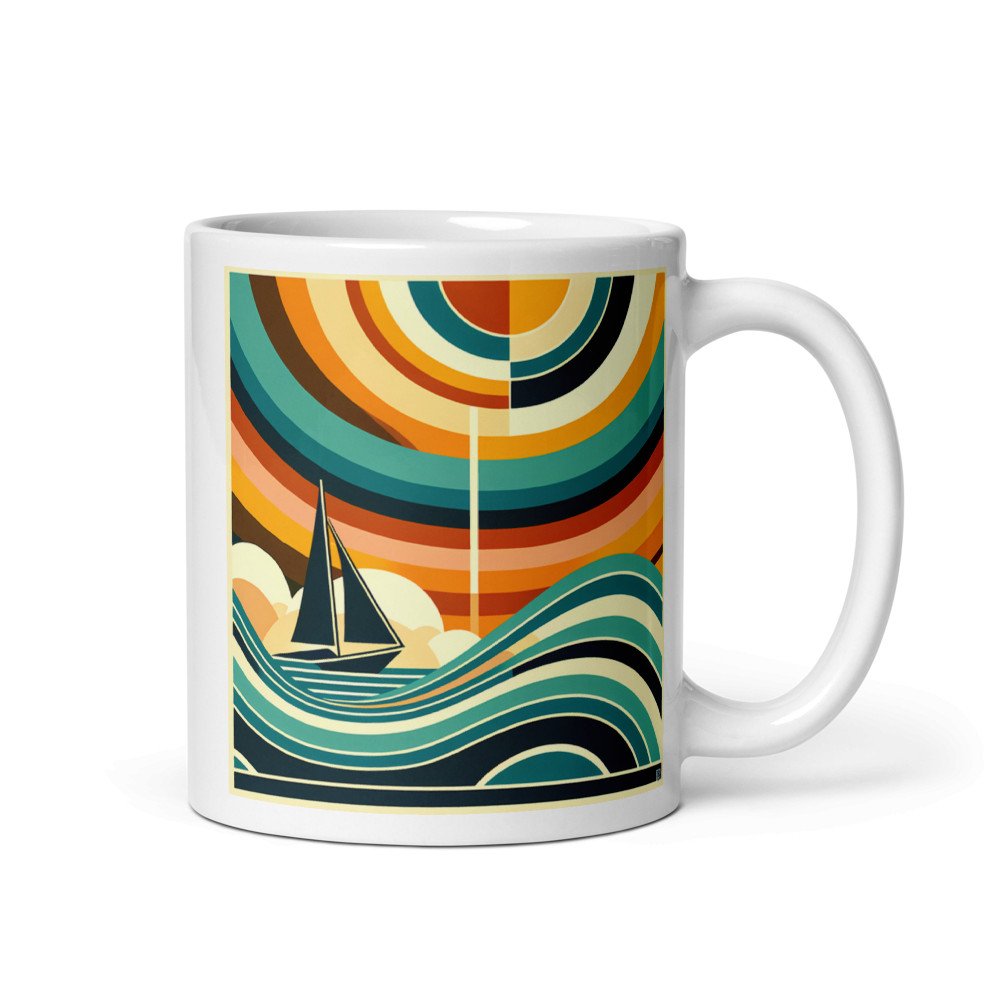 Amber TideGeometric Sailboat Beneath Concentric Sunset Waves — Mug