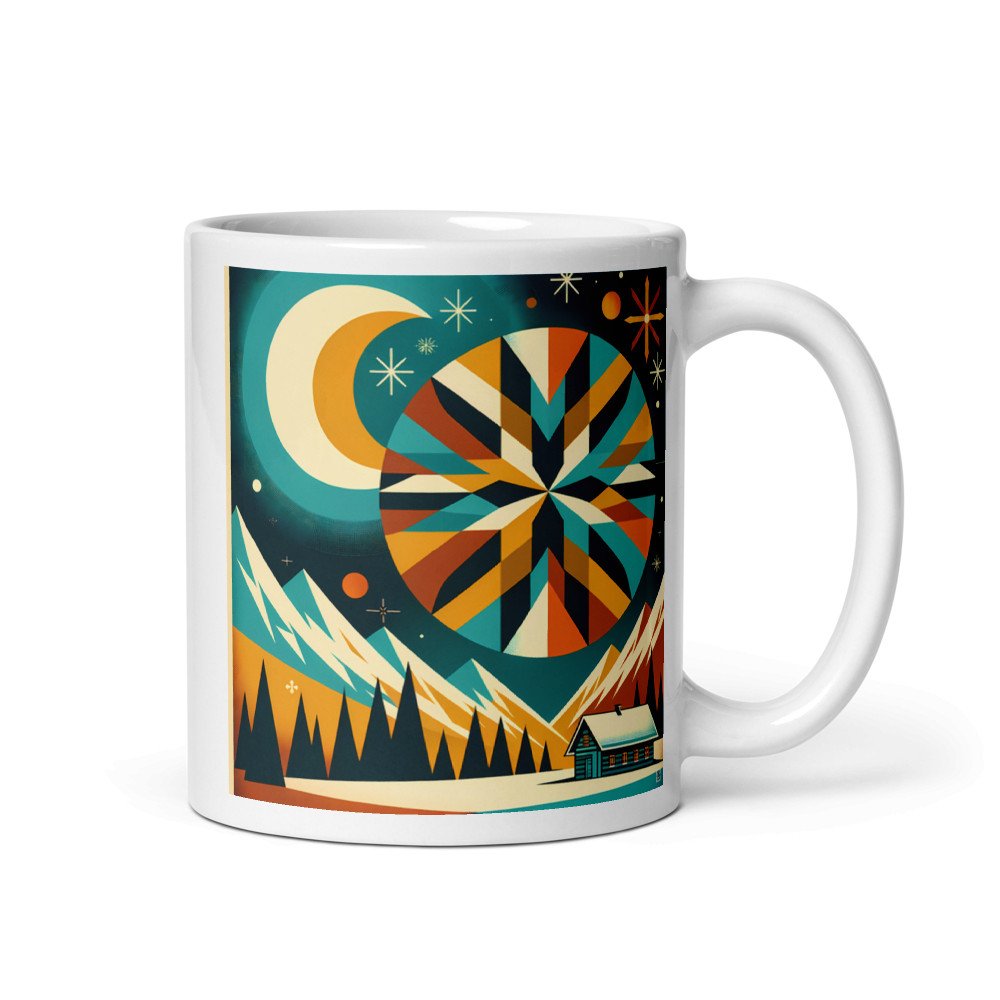 Frost NocturneGeometric Winter Moon and Snowflake Landscape — Mug