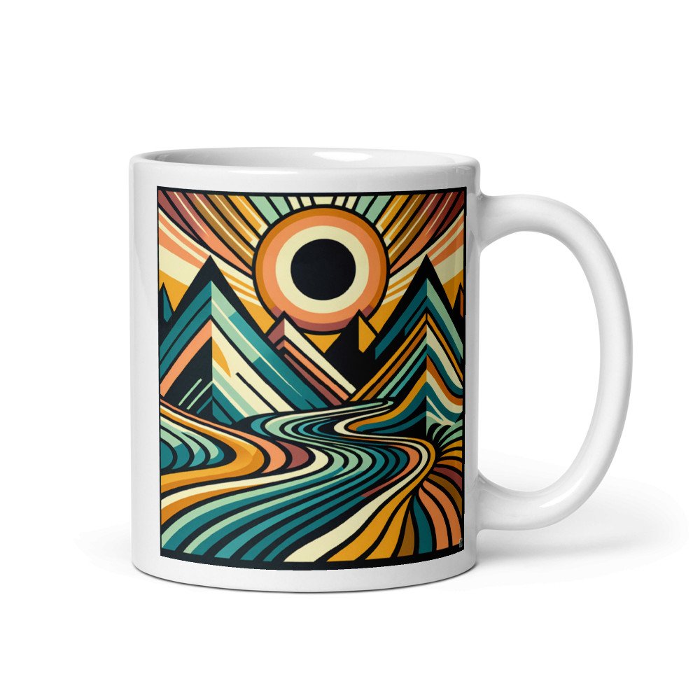 Morning coffee feels more deliberate when the glossy ceramic surface wraps the geometric mountain sunrise around your hands. The teal and amber bands radiate from a bold circular sun, printed edge to edge for a continuous view. Dishwasher safe, so the abstract terrain endures daily use.
