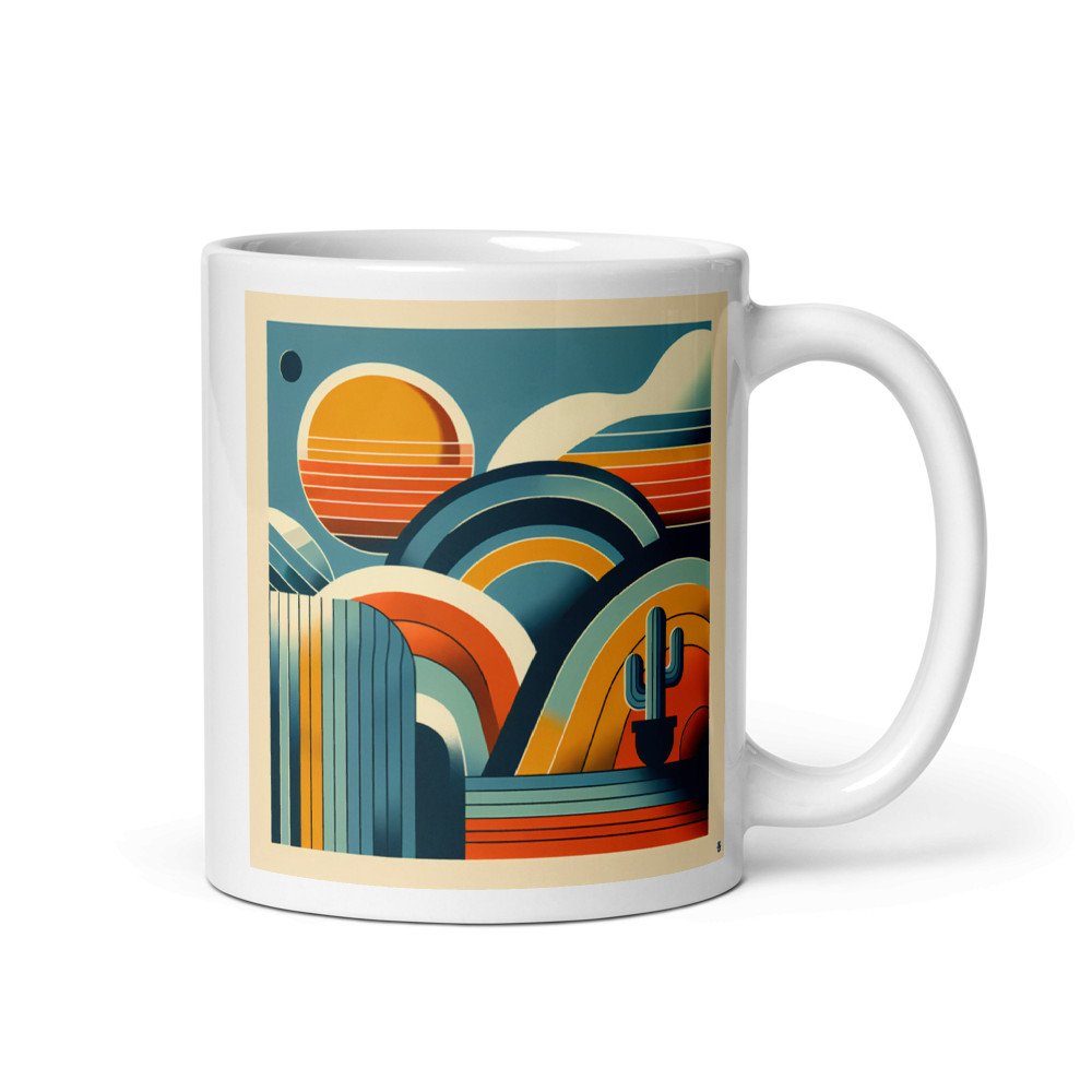 This glossy ceramic mug brings a touch of serene desert geometry to your daily routine. The wraparound print features layered arches and a striped sun, its burnt orange and cream tones appearing vibrant against the white surface.