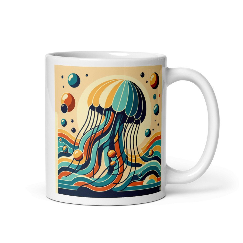 Coral TideRetro jellyfish over stylised ocean waves — Mug