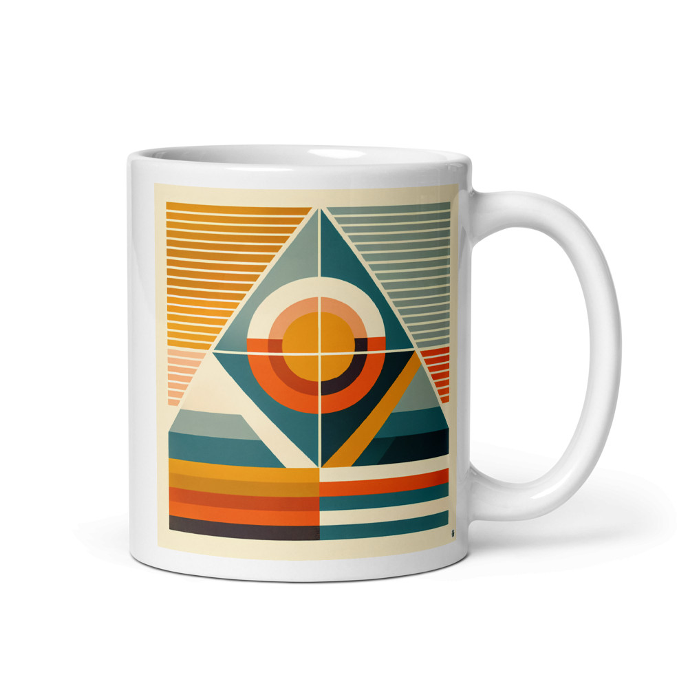 A glossy ceramic mug makes the most of the geometric sun and triangle composition with a wraparound print that catches the eye from every angle. The warm cream and orange shapes stand out against the teal accents, and the dishwasher-safe finish keeps it practical for daily use.