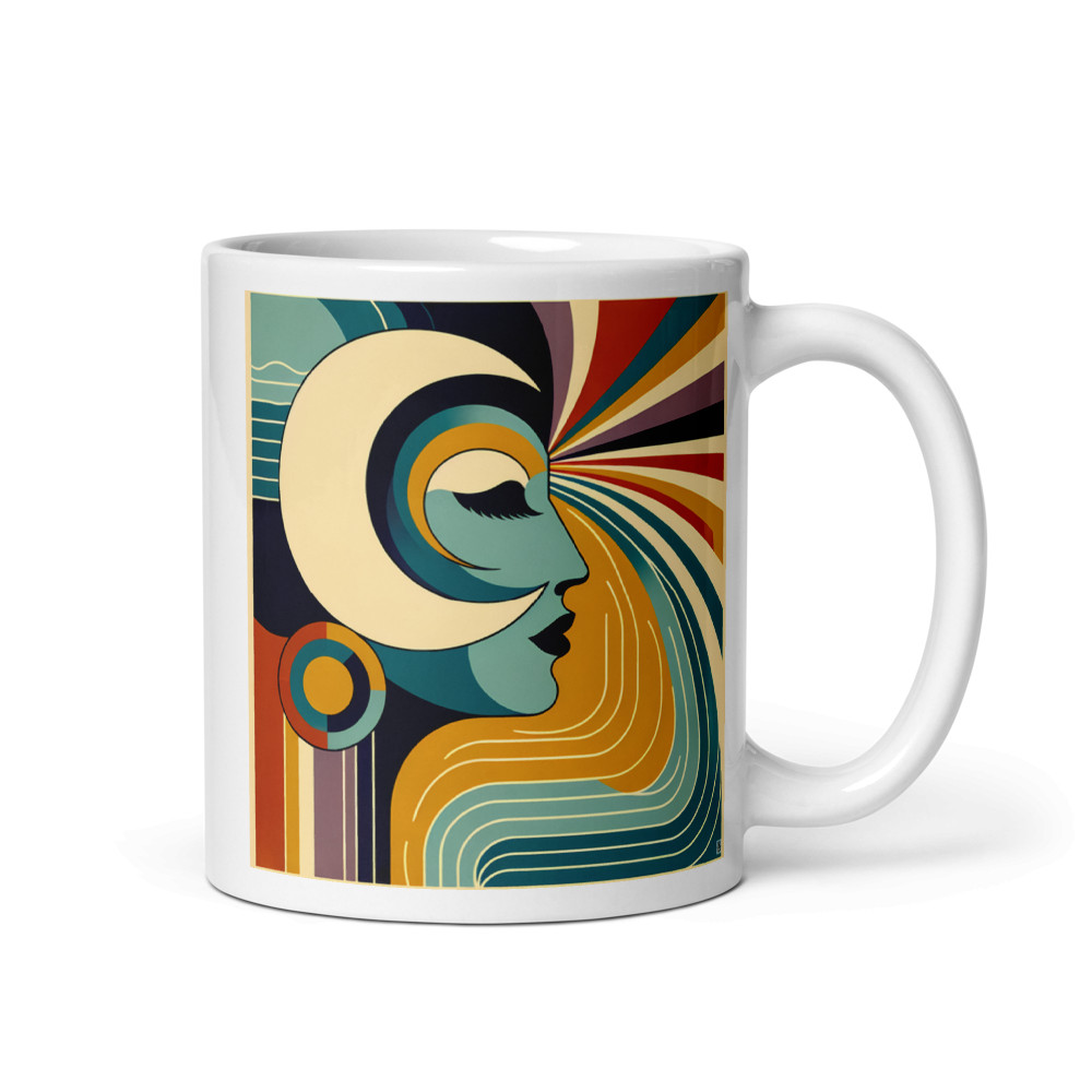 Glossy ceramic gives the cosmic geometry a smooth, reflective finish as it wraps around the entire mug. Teal and cream curves meet a radiant sunburst, turning each sip into a quiet encounter with mid-century minimalism. Dishwasher-safe, so the bold abstract lines stay crisp through daily use.