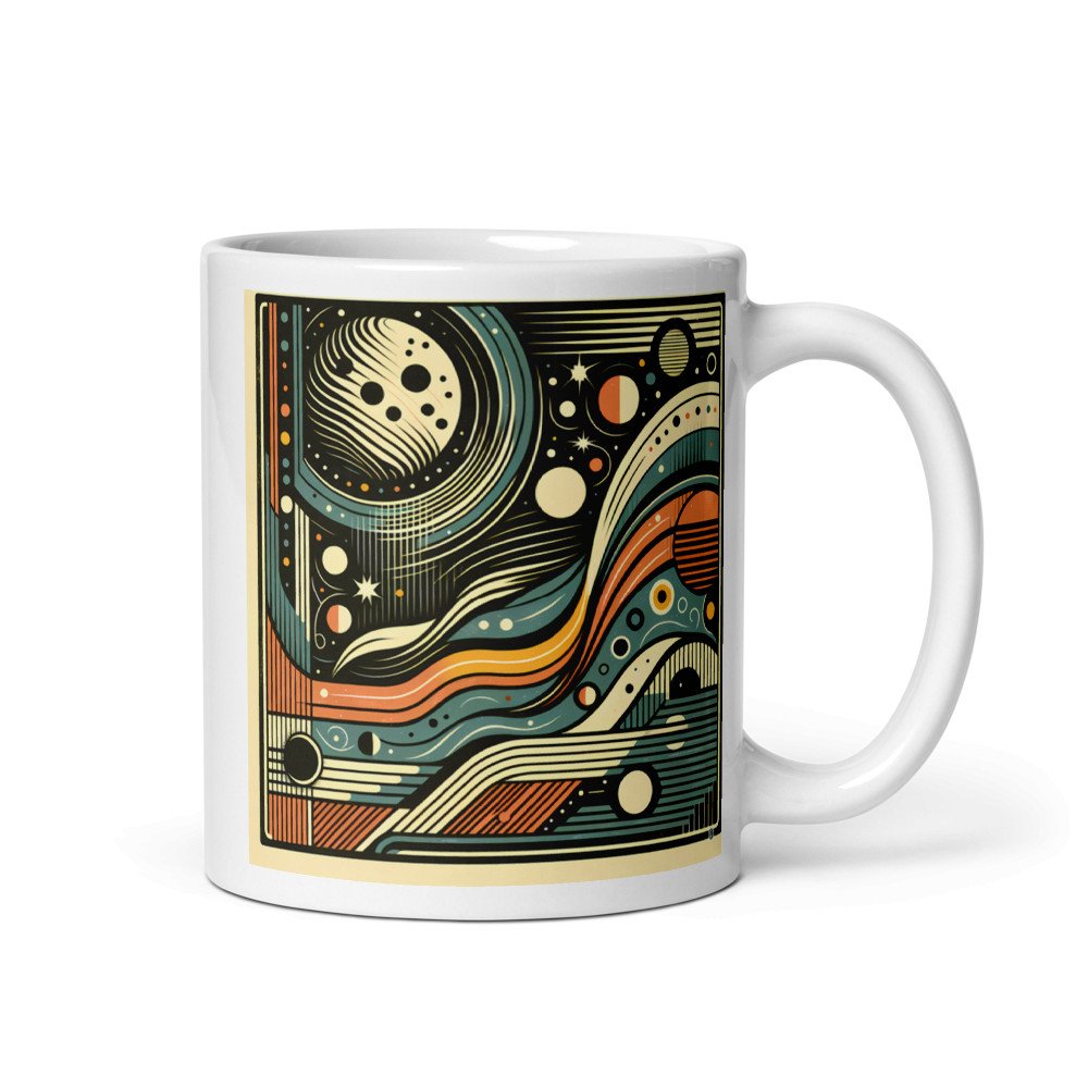 Cosmic TidesRetro Space Abstract with Planets and Wavy Stripes — Mug