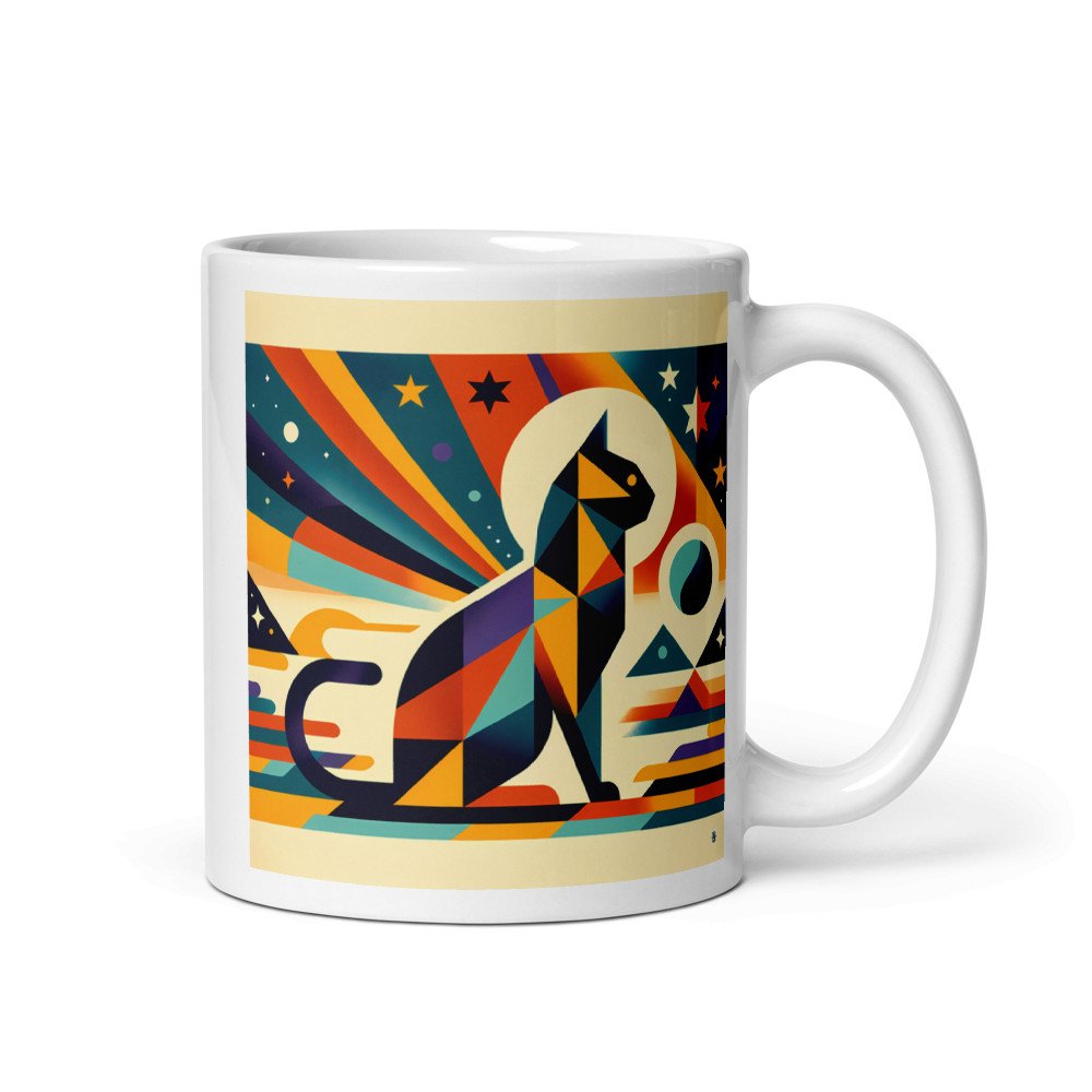A stylised geometric cat sits in a cosmic scene with stars, a bold sunburst, and a crescent moon. Angular colour blocks in teal, orange, navy and cream create a modern retro look with crisp shapes and subtle grain texture.