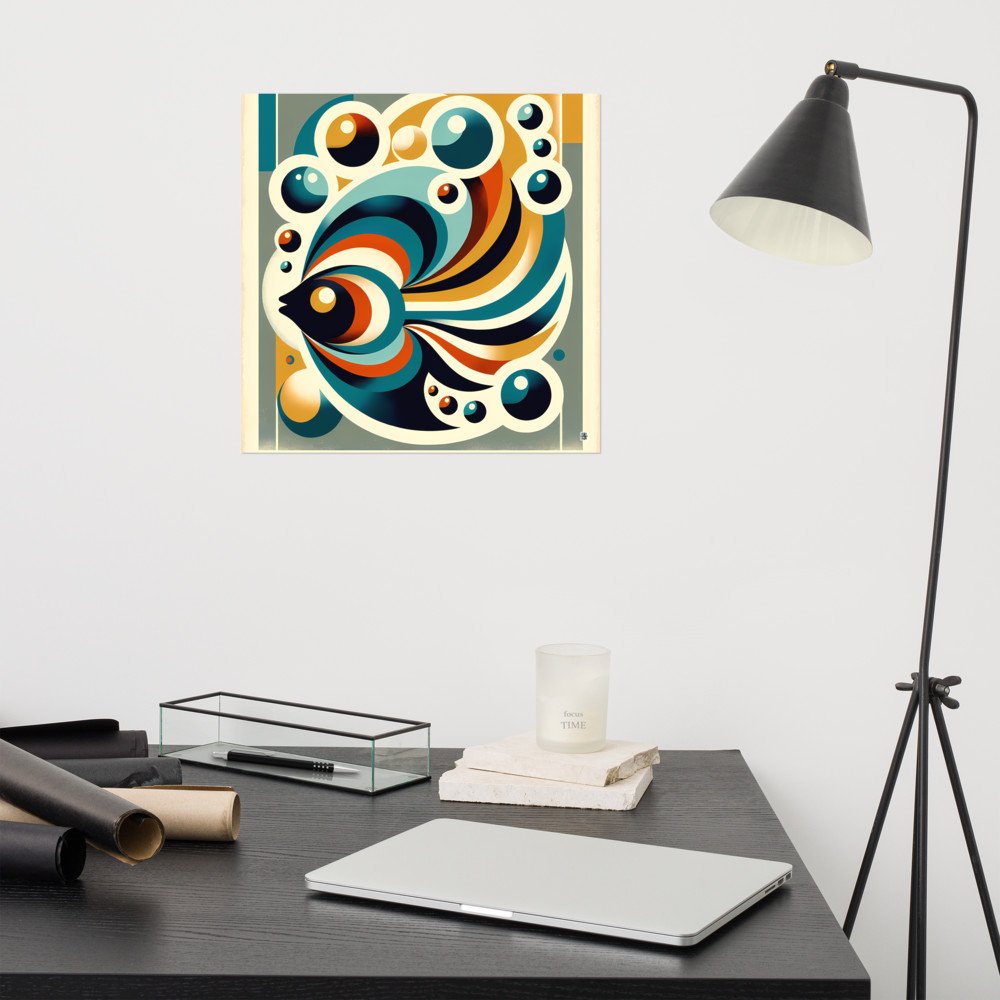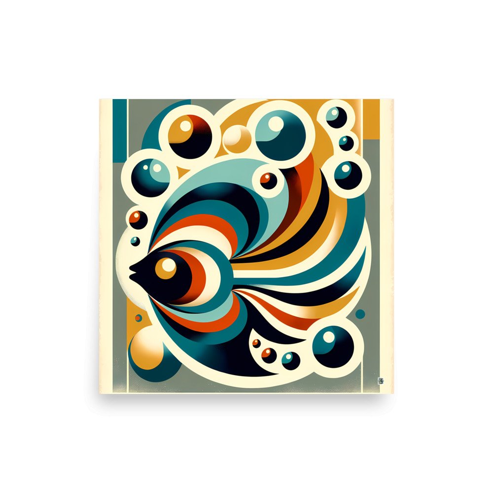 Aqua Reverie IIIRetro Geometric Fish with Bubbles in Teal and Ochre — Poster