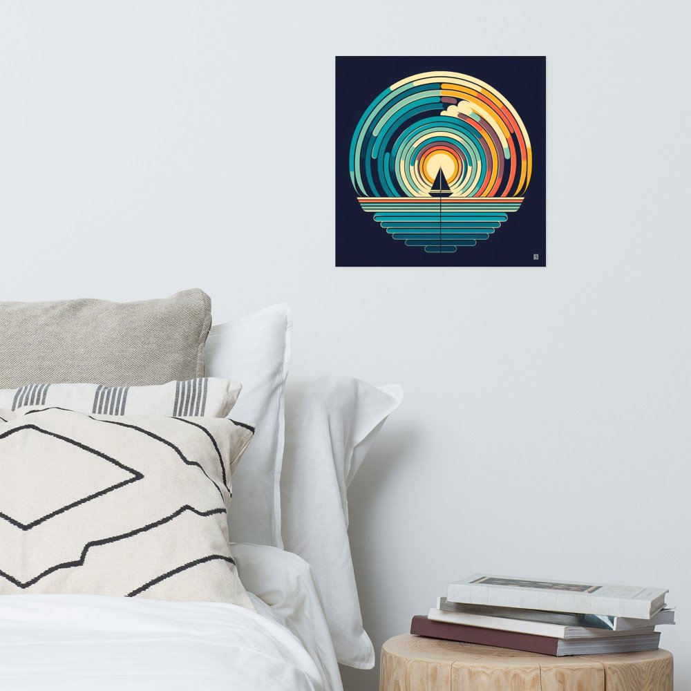 A stylised sailboat silhouette sits on layered waves beneath a glowing sun. Concentric arcs form a bold, retro-inspired sky with a small cloud detail. The palette blends teal, cream, mustard, and coral on a deep navy background.