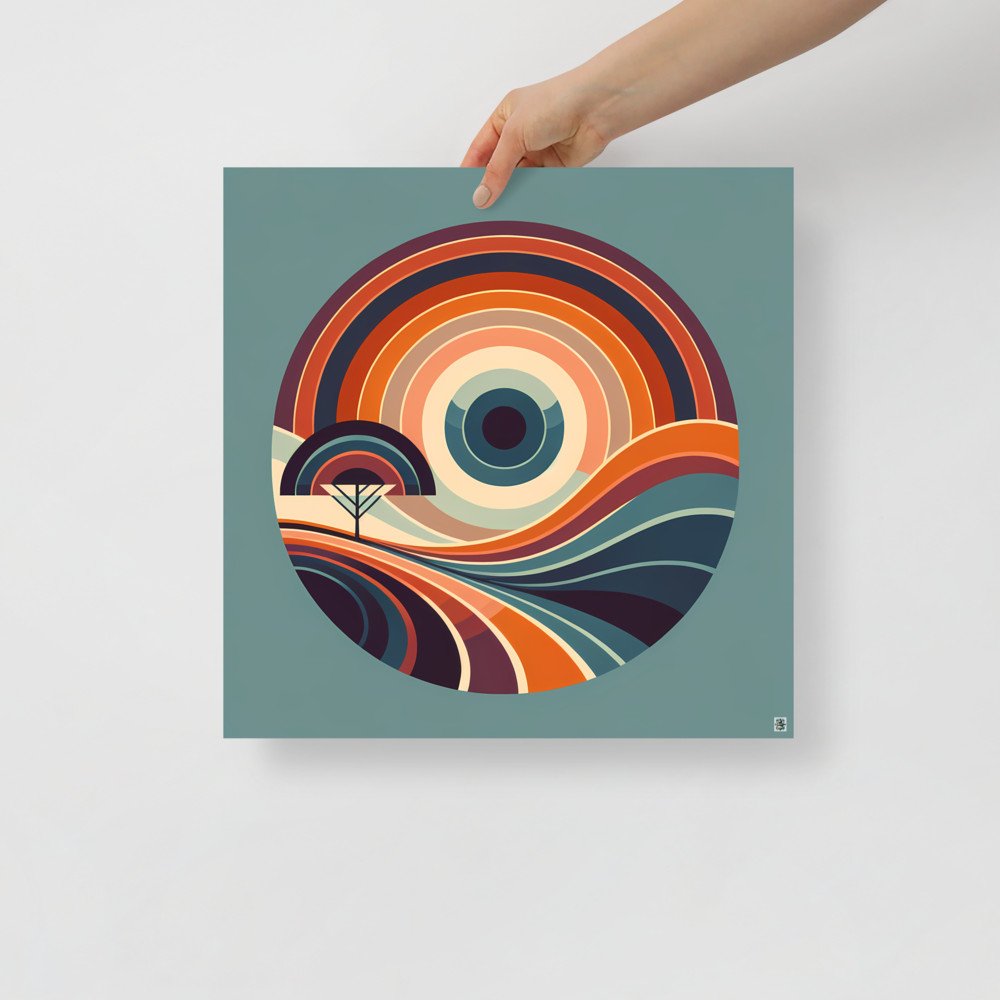 Printed on substantial matte paper, this poster captures the crisp detail of the retro sunset. The archival quality ensures the vibrant teal, navy, and rust stripes remain a lasting source of visual interest.