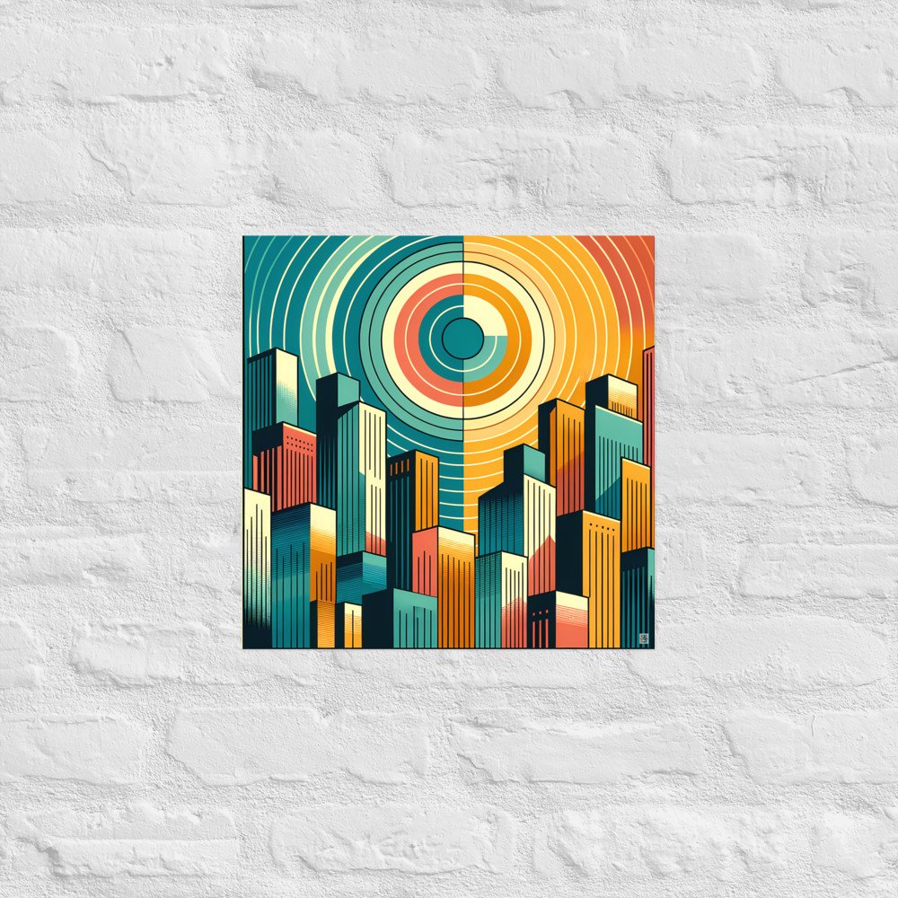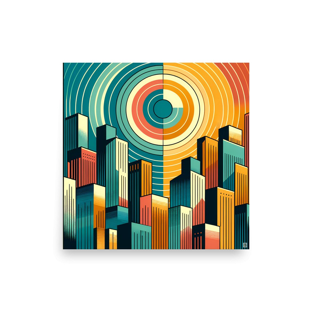 Solar PrismRetro Geometric City Skyline with Concentric Sun — Poster