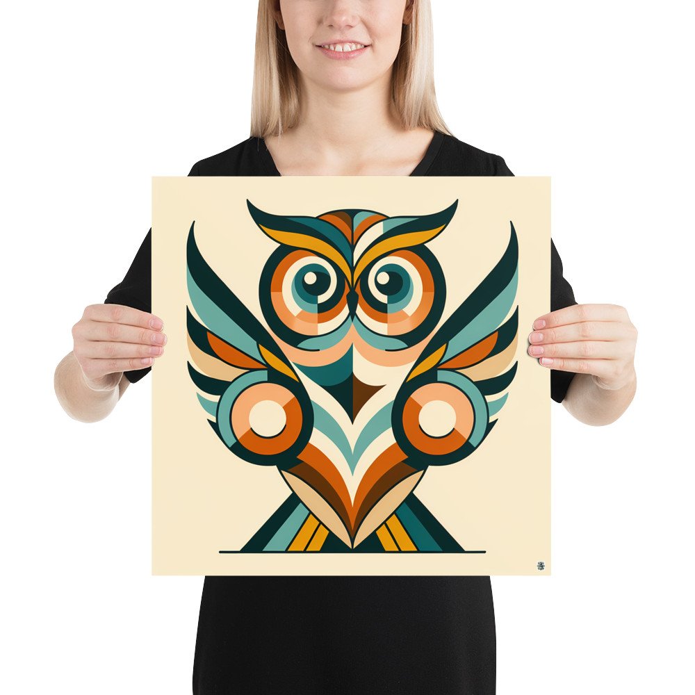 Printed on heavyweight archival paper, this poster captures the clean, abstract shapes of the vintage-inspired design. The stylised owl's bold symmetry and teal-and-orange palette are preserved with a matte finish.
