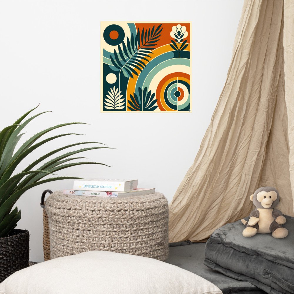 Printed on substantial matte archival paper, this piece is made for thoughtful display. The graphic blend of concentric circles and abstract leaves in a contrasting teal and burnt orange scheme feels both contemporary and timeless.