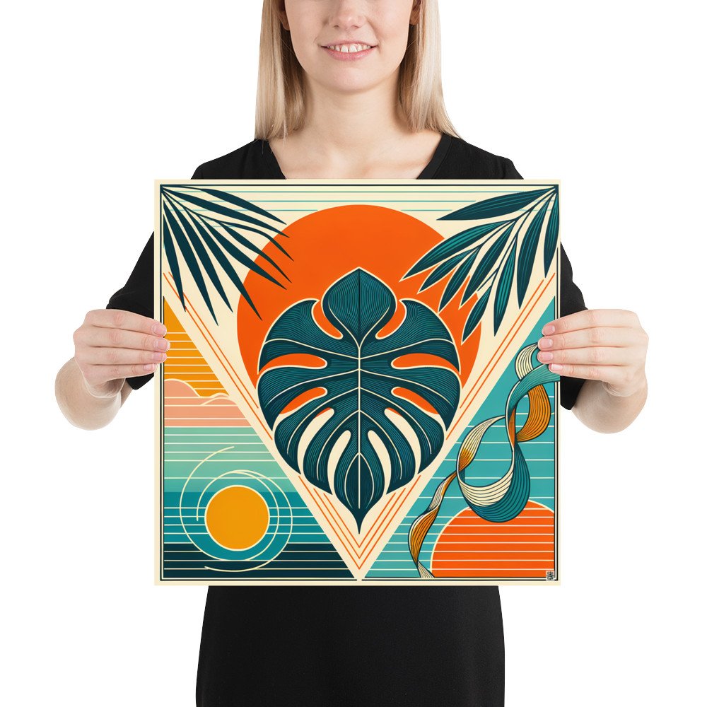 Printed on heavyweight archival paper, this piece captures the crisp detail of the layered design. Its clean, geometric interpretation of a tropical leaf, rendered in teal and orange, suits a minimalist gallery arrangement.