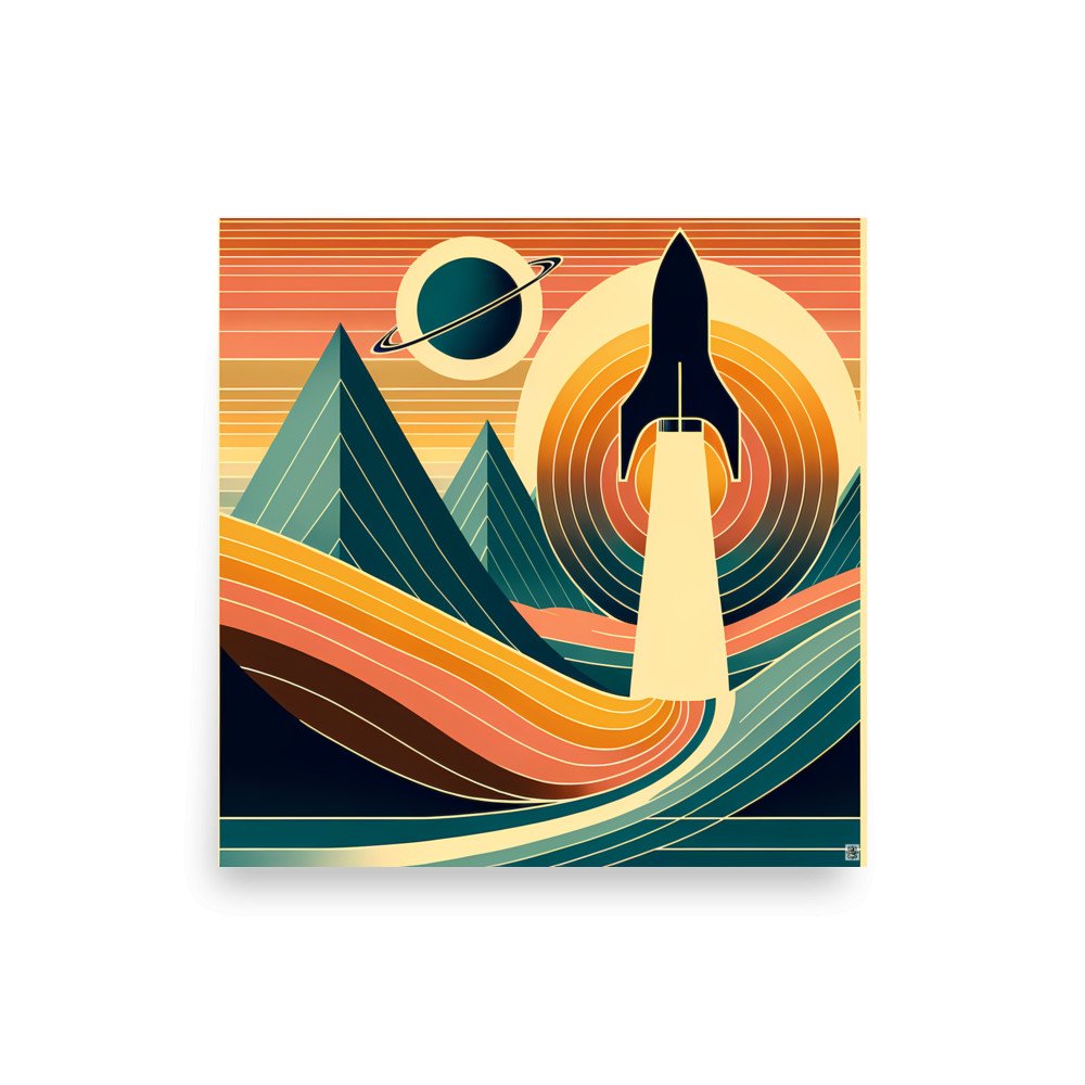 Retro Rocket Launch Over Geometric Mountains — Poster