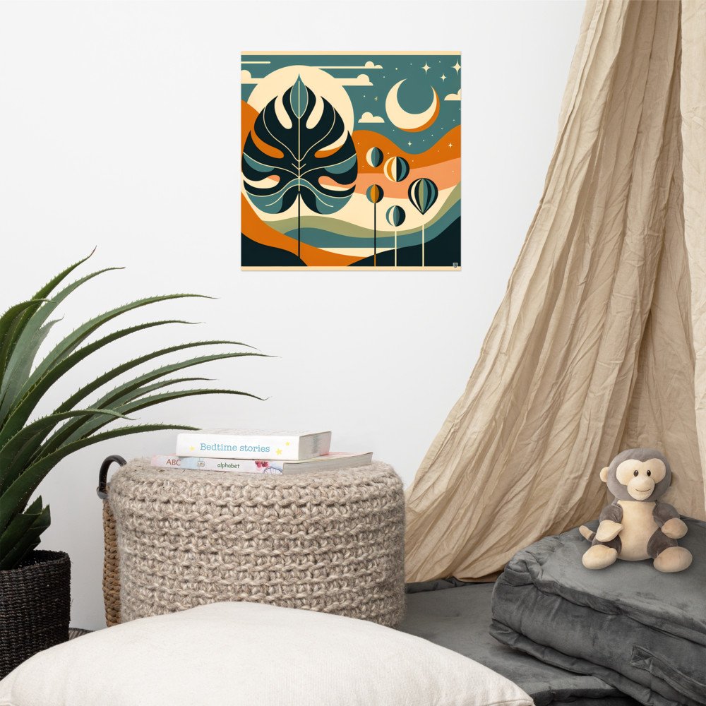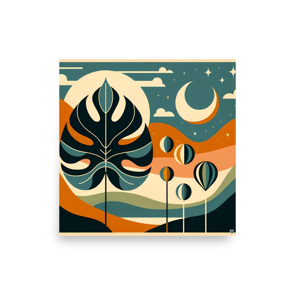 Printed on substantial matte paper, this piece captures the subtle depth of the minimalist night landscape. Its archival quality ensures the fine details of the celestial botanical design remain sharp and clear.