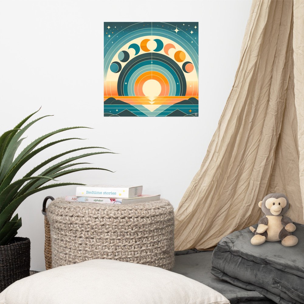 Geometric Moon Phases Over Retro Sunrise — Poster