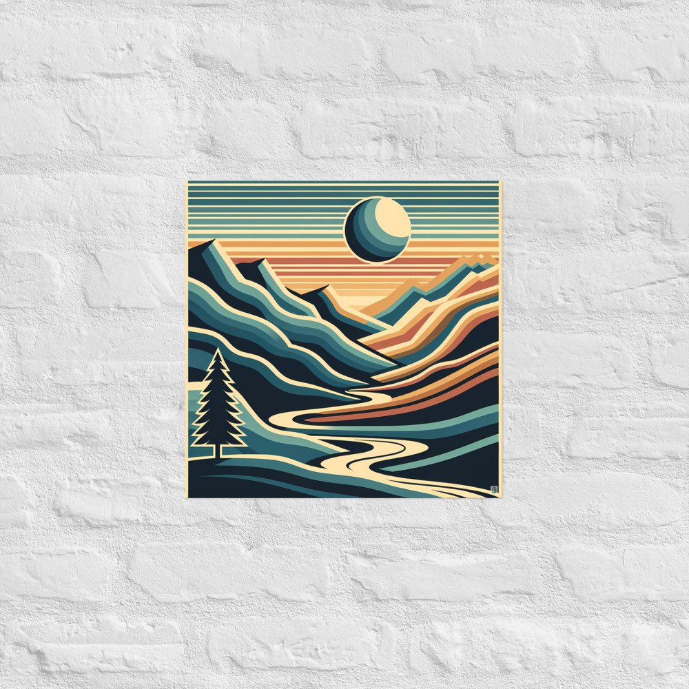 Elysian RiverbendGeometric Mountain Valley with Sun and River — Poster
