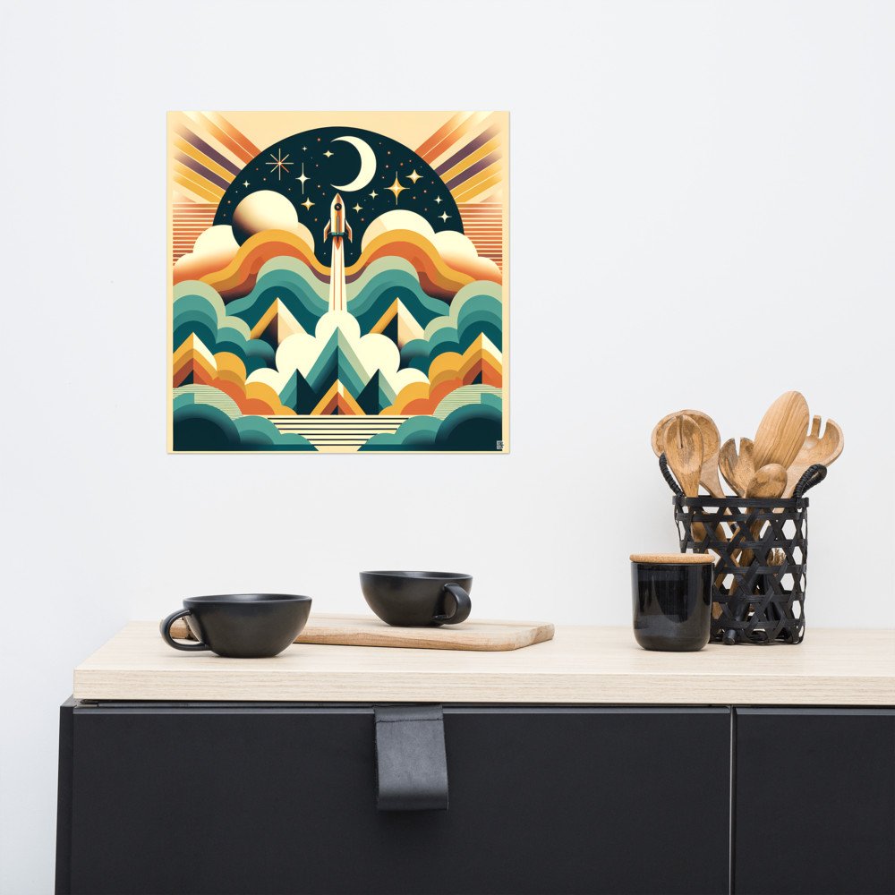 Printed on heavyweight matte paper, this archival poster captures every detail of the stylised launch. The warm gradients and crisp, geometric forms of the illustration are preserved for lasting display.