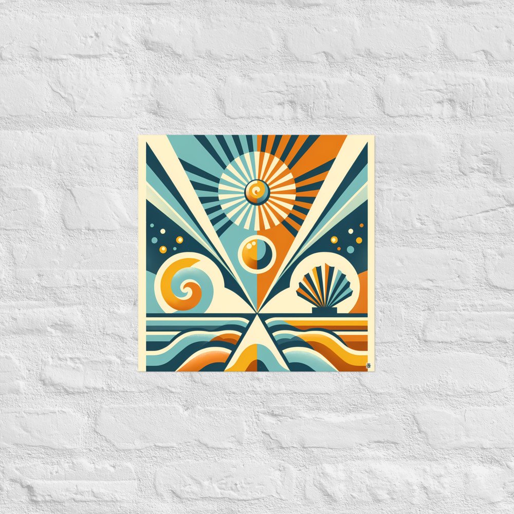 A bold geometric composition featuring a central sunburst, circular orbs, and layered wave bands in teal, navy, cream, and burnt orange. Symmetrical shapes and radiating lines create a crisp, modern typographic-geometry feel without text. Clean colour blocking and subtle grain add a retro-inspired graphic finish, echoing geometric typography aesthetics.