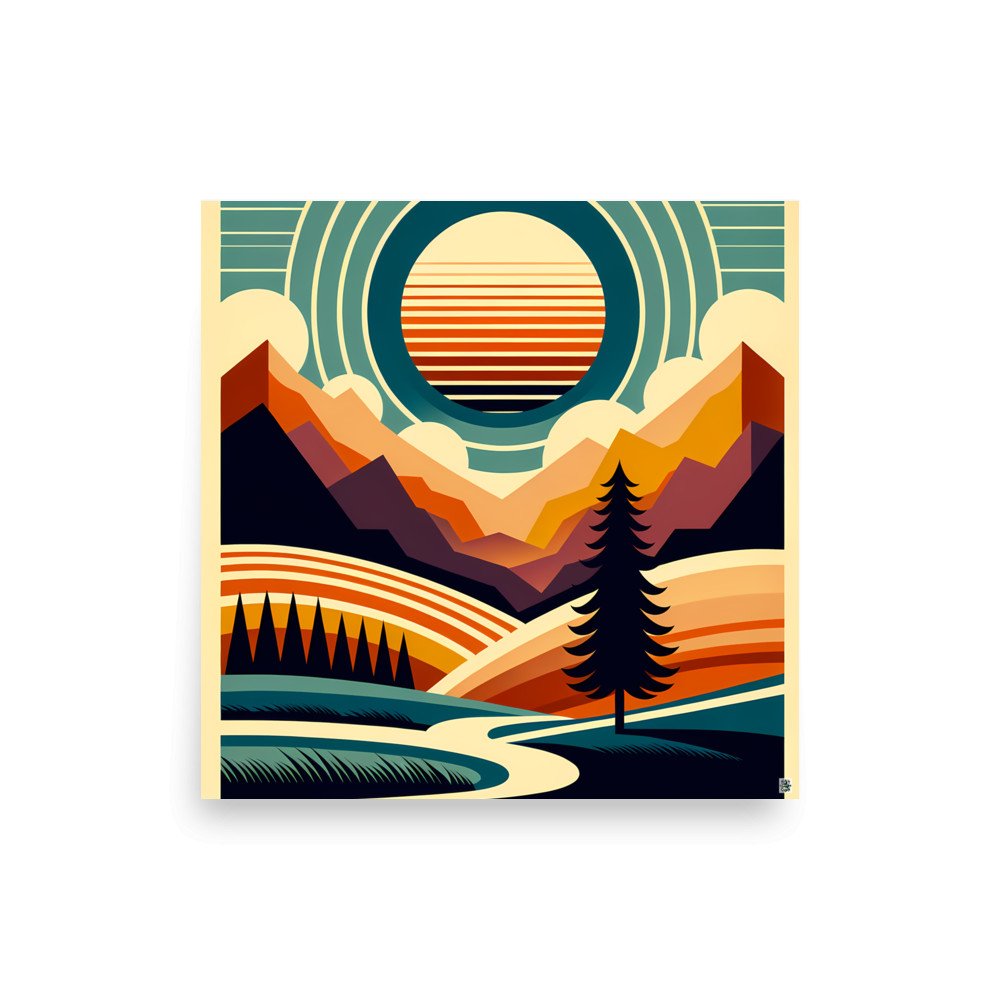 A stylised geometric landscape featuring layered mountains, rolling hills, and a lone pine tree beneath a striped sun and radiating arcs. Warm oranges and ochres contrast with deep navy and teal shapes for a modern, minimal landscape look. Clean silhouettes and bold gradients create a calm sun and mountains scene.