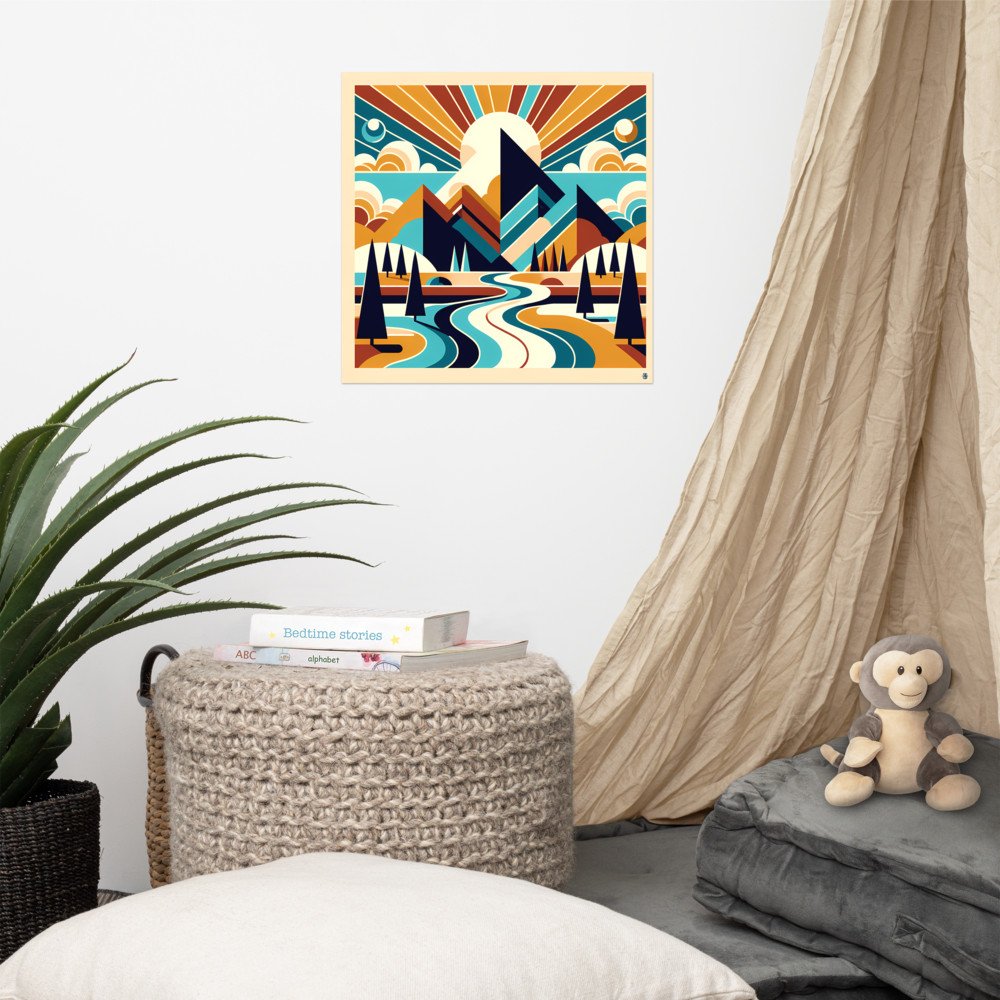 Geometric Mountain Peaks with River and Sunburst — Poster