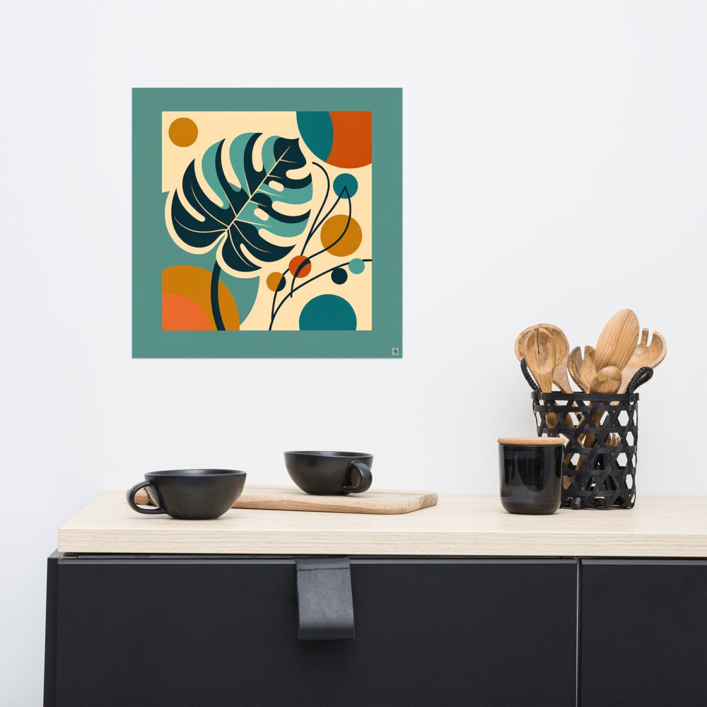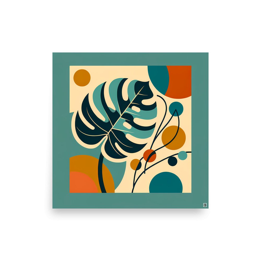 A bold abstract botanical composition featuring a stylised monstera leaf layered with geometric circles and curved stems. Teal, navy, ochre and burnt orange shapes create a modern, mid-century inspired balance of organic forms and clean geometry. This minimal plant art uses flat colour blocks and soft contrasts for a calm, contemporary look.