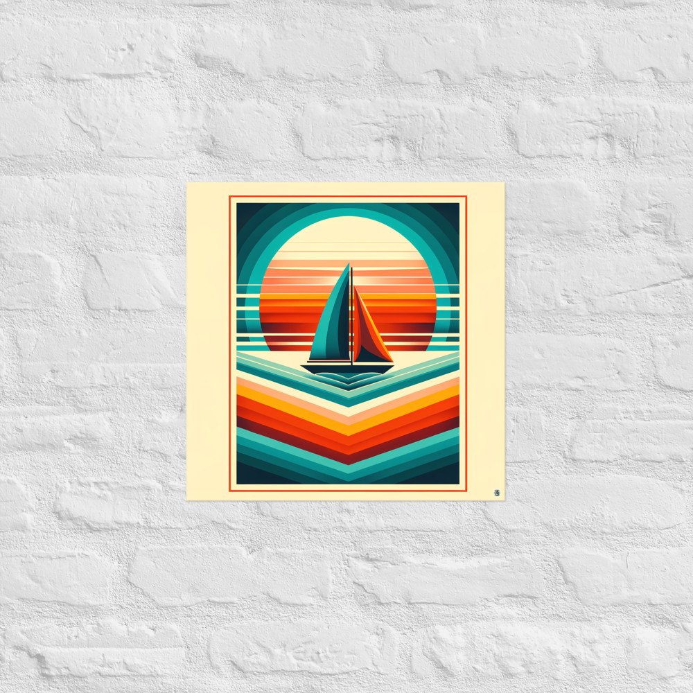 A stylised sailboat silhouette cuts through layered bands of colour beneath a bold circular sunset. Clean geometric shapes and crisp stripes create a modern abstract print with a colour block look. Teal, orange, and coral gradients add a retro-inspired graphic art feel.