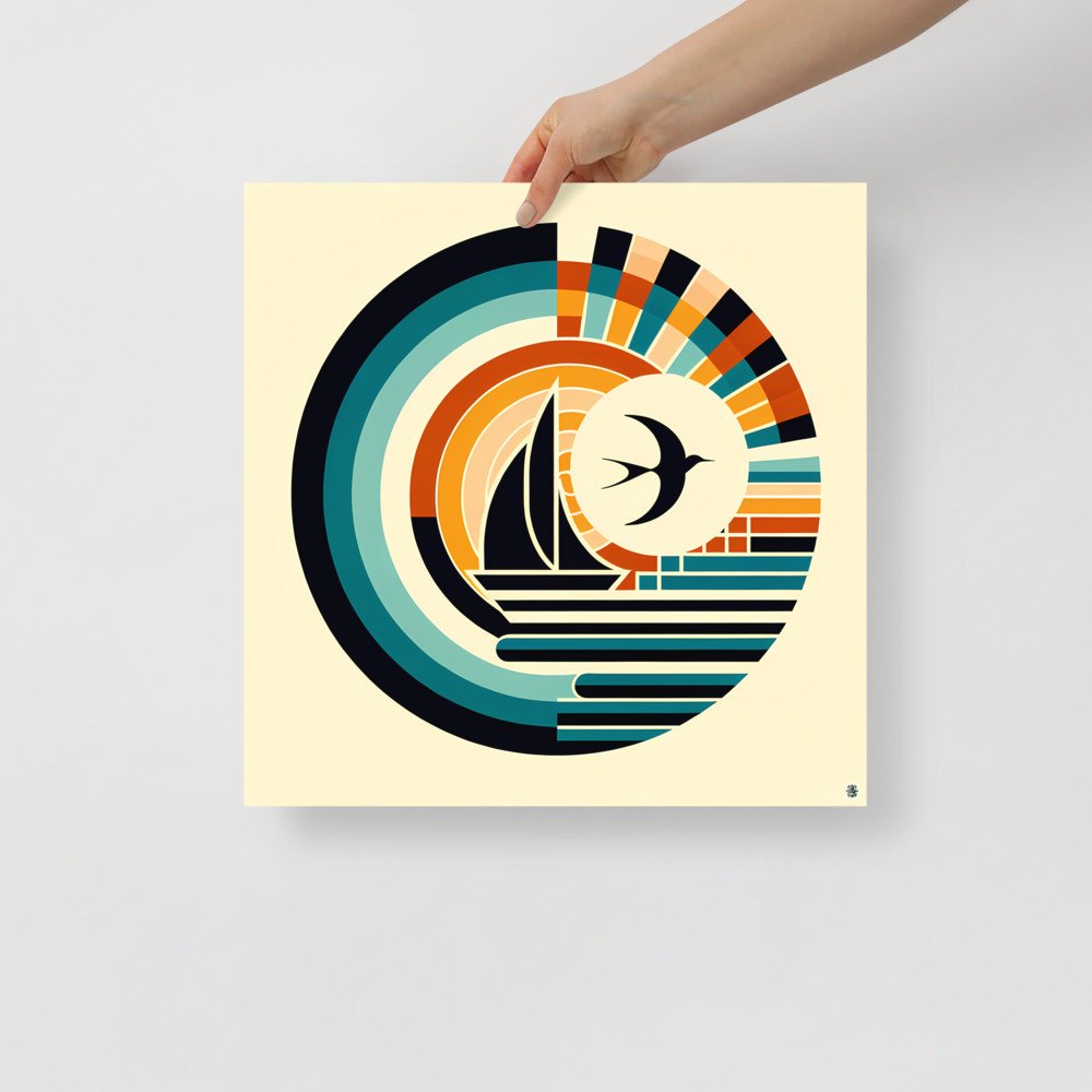 Geometric Sailboat and Swallow Sunset Emblem — Poster