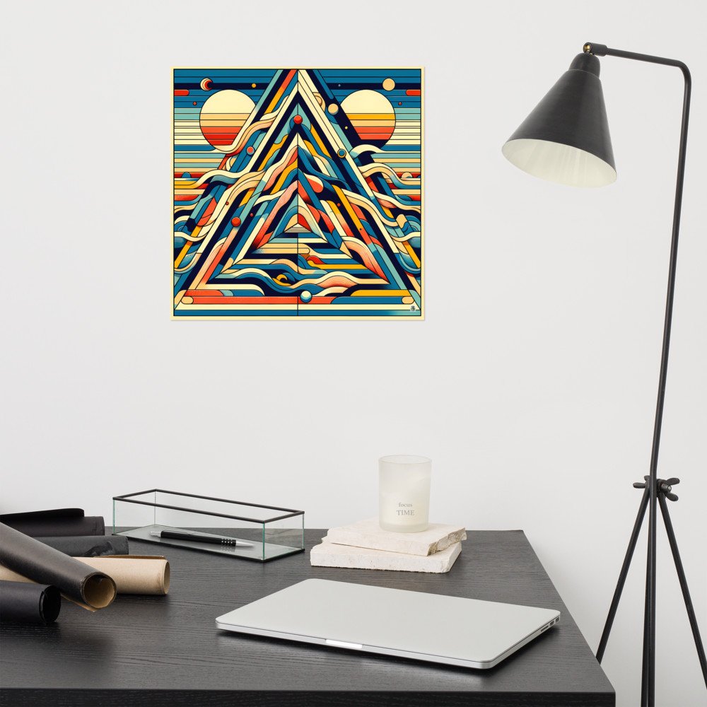 Printed on heavyweight matte paper, this is a crisp reproduction of the retro mountain scene. The archival quality ensures the vivid blues and warm sunset hues of the geometric design remain sharp and true.