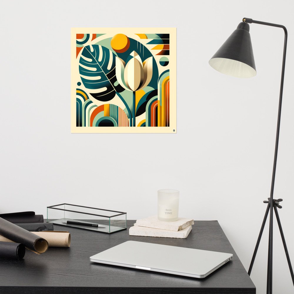 A bold geometric botanical composition featuring a stylised tulip bloom and a large monstera leaf set within layered circles and arches. The palette mixes teal, mustard, rust, and cream with subtle grainy shading for depth. Clean shapes and balanced negative space give it a modern botanical, minimal botanical feel.