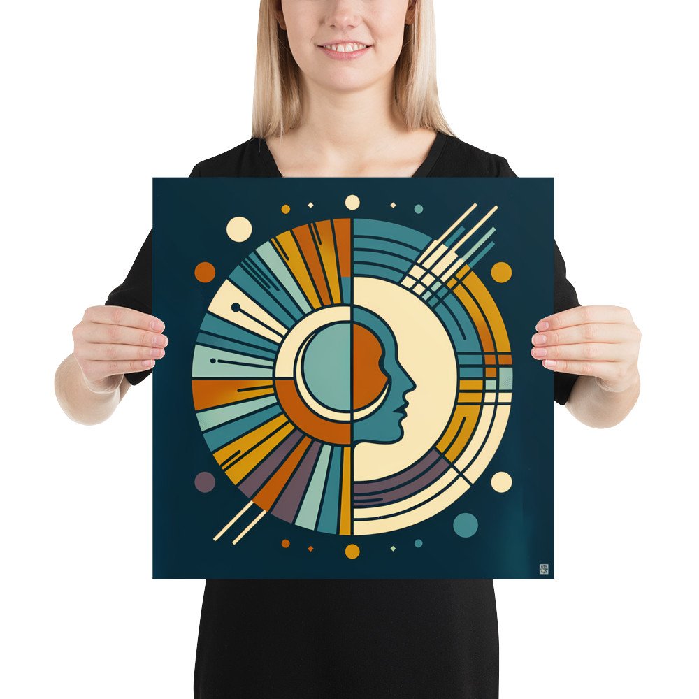 A stylised profile face sits inside a crescent moon, framed by concentric geometric rings and orbiting dots. The palette blends teal, cream, mustard and burnt orange on a deep navy background for a retro-futurist feel. Clean linework and balanced shapes echo modern minimal and abstract portrait line aesthetics.