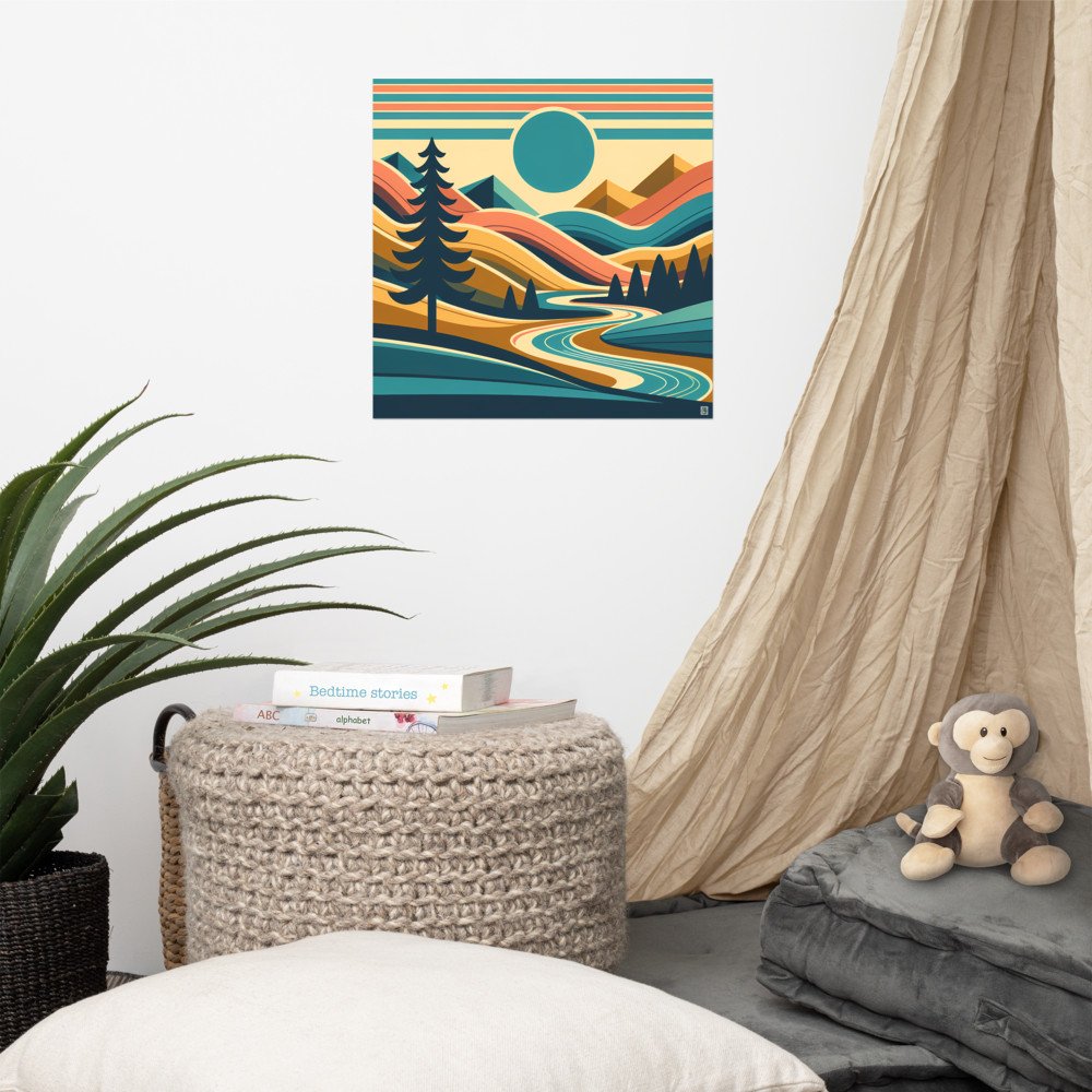 A stylised abstract landscape with layered hills, geometric mountains, a winding river and a bold circular sun. Teal, ochre and coral tones create a minimal landscape with flowing shapes and strong retro-inspired lines. The composition blends geometric nature elements with a clean, modern scenic feel.
