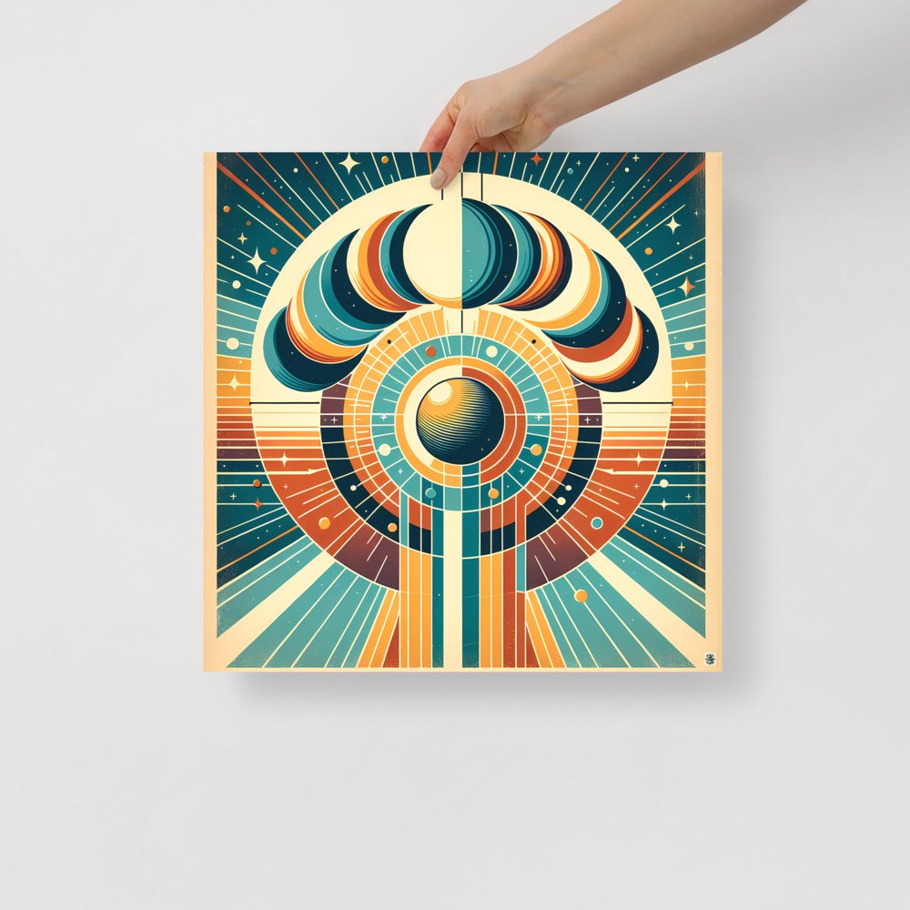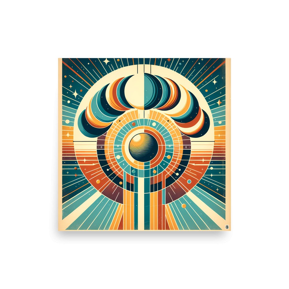 A symmetrical celestial composition featuring layered moon phases above a radiant circular centre. Bold teal, orange and cream shapes combine with cosmic line art and abstract space details for a striking retro-futurist look. Fine stars, rays and concentric geometry create a balanced celestial minimal design.