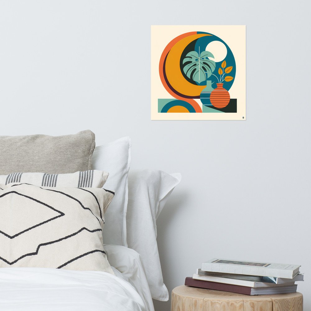 A bold abstract botanical composition featuring a stylised monstera leaf, curved geometric forms and striped vases in teal, orange and cream. The design blends modern floral elements with clean balance and layered colour blocking. Its abstract botanical look pairs organic minimal shapes with a calm mid-century inspired arrangement.