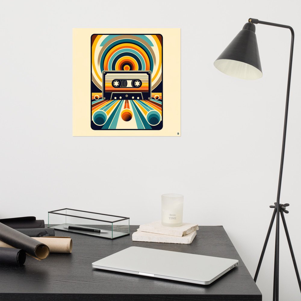 A vintage cassette tape sits at the centre of layered rainbow arcs and radiating stripes in teal, orange, cream and navy. The composition blends retro type energy with bold geometric styling, creating a clean graphic text art feel without using words. Strong symmetry and warm colour contrast give the design a striking modern vintage look.