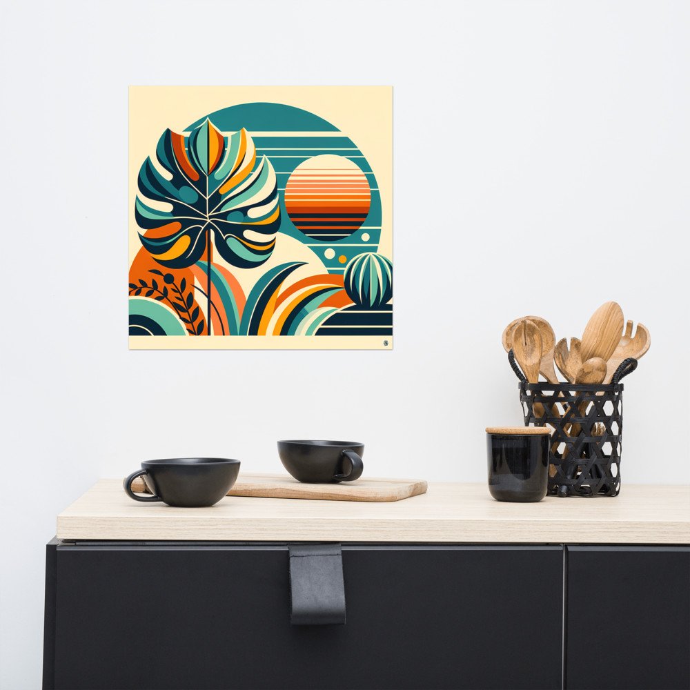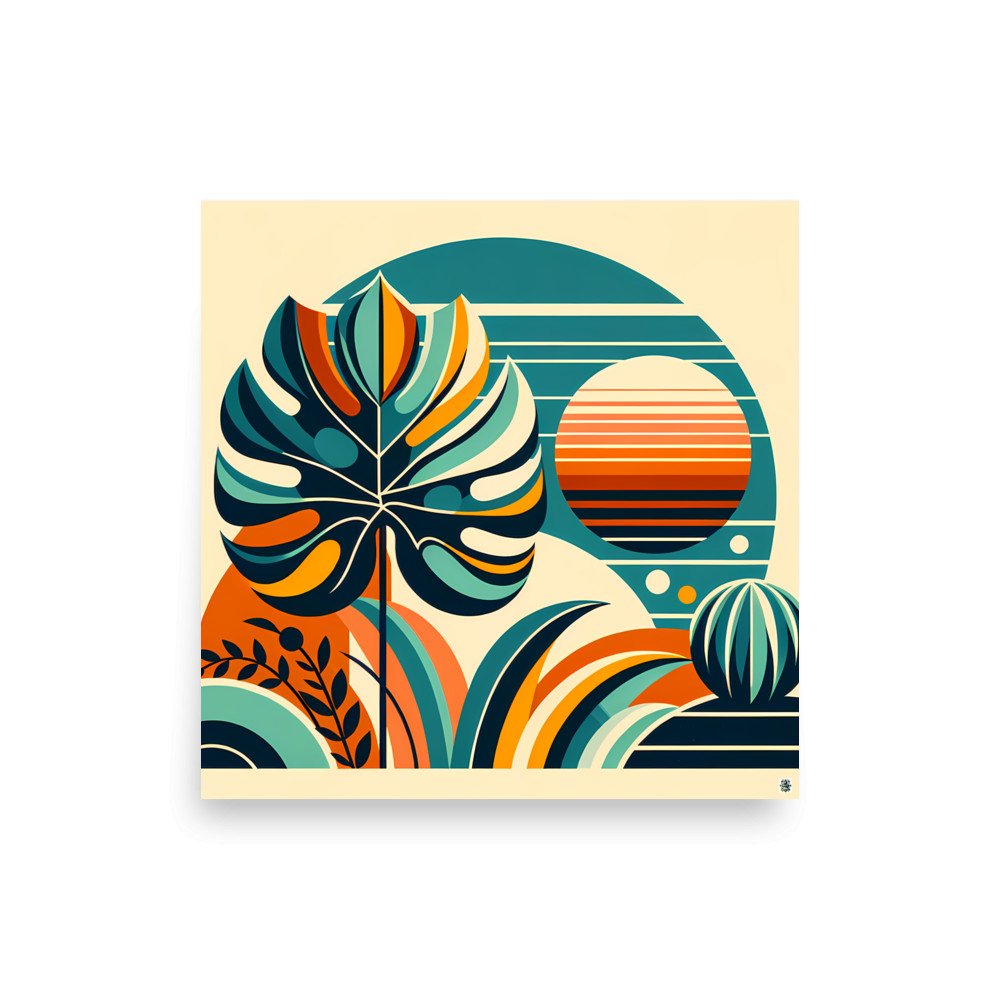 A bold abstract botanical composition featuring a large monstera leaf, layered organic forms and a striped sun. Teal, orange and cream tones create a retro-modern palette with geometric leaves and tropical shapes. The clean curves and balanced layout give it a minimal plant art feel with strong abstract botanical styling.