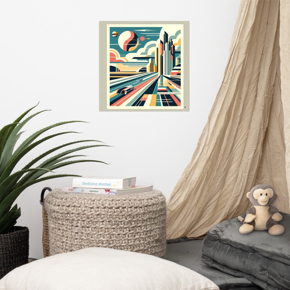 Neon VelocityRetro Futuristic City Skyline with Speeding Car — Poster