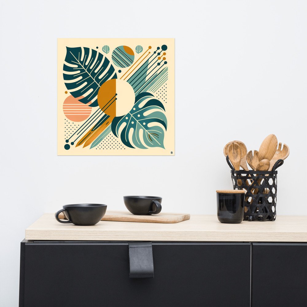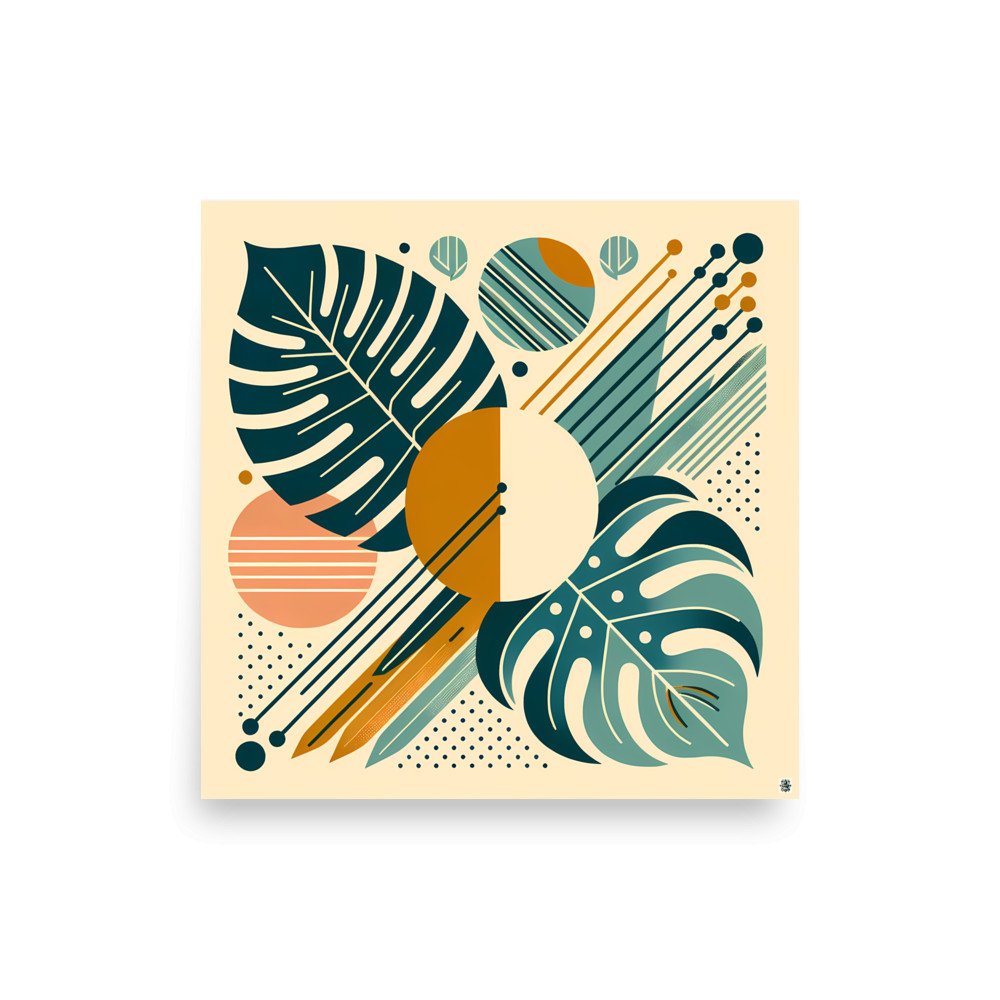 An abstract botanical composition featuring bold monstera leaves, striped circles and diagonal linework in teal, mustard and peach. The layered shapes create a modern floral rhythm with a clean geometric leaves aesthetic. Soft texture and balanced symmetry give the design a refined mid-century feel.