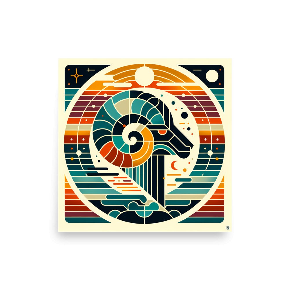 A stylised ram head is built from bold geometric shapes, layered arcs and celestial details in teal, orange, cream and deep navy. The composition blends zodiac sign imagery with celestial geometric styling, creating a striking piece of constellation art with a retro modern feel.
